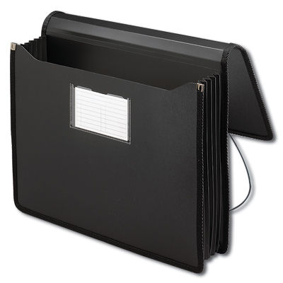 Description:  Acts as a portable attaché case! Super durable polypropylene wallet expands to 5 1/4". Generous width allows top tab file folders to fit without bulging side gusset. Sewn-in, full perimeter reinforced black rubber gusset. Clear pocket on front includes index card insert.