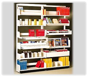 There are many accessories and special type shelves that fit onto the cantilever center frame. Special shelves for periodicals, paperback books, audio tapes, CD’s, audio books and DVD collections can all be added to supplement standard book shelving. Plus special display racks and various way to store newspapers.