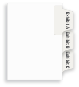 Description: Exhibit A-Z Set, side tab, 2 banks of 10 tabs each & 1 bank of 6. 80# white paper stock with clear rip-proof reinforced tabs. Tabs are printed on both sides. Binding edge is unpunched so indexes can fit any binding system. Franklin Mills dividers are Made in the USA.