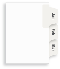 Description: Monthly Divider Set. Side tab, 1/12th cut - 2 sets. 80# white paper stock with clear rip-proof reinforced tabs. Tabs are printed on both sides. Binding edge is unpunched so indexes can fit any binding system. Franklin Mills dividers are Made in the USA.