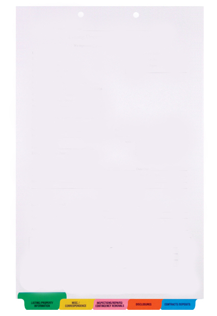 Pre-printed Realtor Transaction tab divider set - Organize your portfolios by keeping all documents in the proper order and tabbed for quick reference. Each tab is reinforced with colored mylar laminated for protection and strength. Legal Size index tab dividers side or bottom tab. All sheets are 2 hole drilled for easy attachment to fasteners. Collated into sets. 100 sets per box.