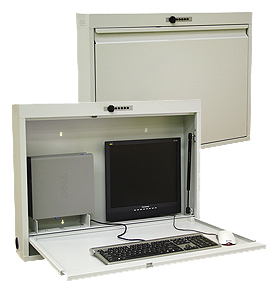 This full-size wall desk provides a solution for your information technology storage and security needs. This versatile workstation has ample space for CPU, monitor, keyboard & mouse. Colors: beige & light grey (Contact Franklin Mills for custom color options). Construction: heavy gauge steel, Size: 241⁄2"H x 32"W x 6"D. Contact Franklin Mills for special pricing.