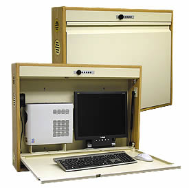 This fashionable full-size wall desk provides a solution for your information technology storage and security needs. This versatile workstation has ample space for CPU, monitor, keyboard & mouse. Specify trim: natural oak or cherry. Color: beige & light grey (Contact Franklin Mills for custom color options). Construction: heavy gauge steel, Size: 251⁄8"H x 31 3/4"W x 6"D. Contact Franklin Mills for special pricing.
